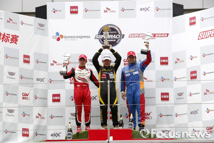 (서울=포커스뉴스) 한국타이어가 후원하는 아트라스BX 레이싱 팀의 조항우 선수가 지난 17일부터 19일까지 펼쳐진 2016 슈퍼레이스 3라운드 상하이전에서 우승컵을 들어올렸다.