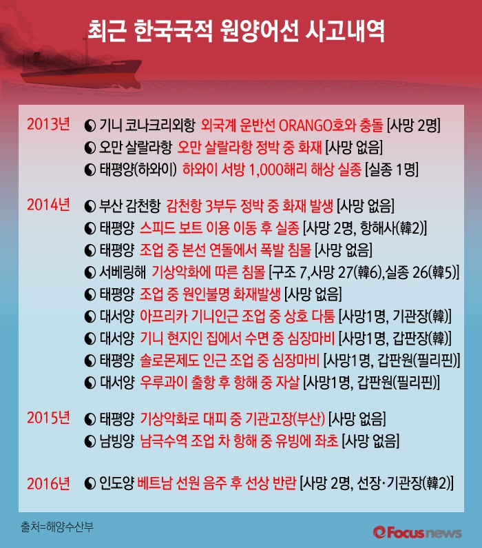 (서울=포커스뉴스) 20일 인도양을 운항하던 부산 광동해운 소속 원양어선(광현 803호)에서 베트남 선원 2명이 음주 후 난동을 부려 한국인 선장과 기관장을 살해하는 사건이 발생했다. 최근 3년간의 자료를 보면 크고 작은 한국 국적 원양어선의 사고가 끊이지 않고 있다.