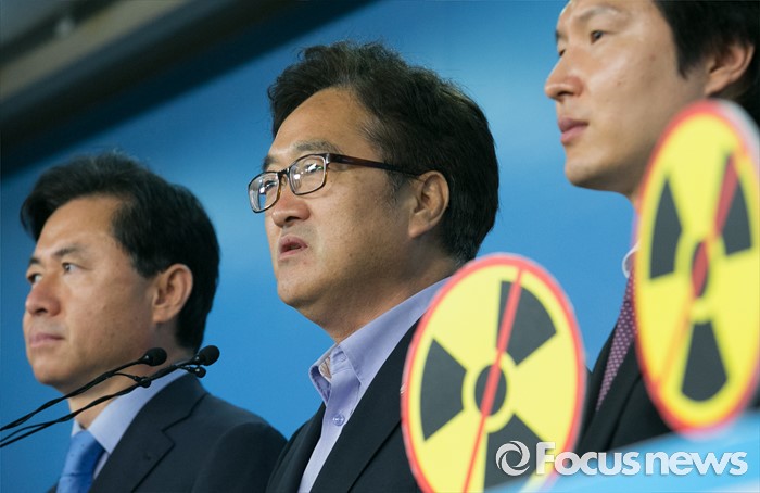 (서울=포커스뉴스) 21일 오전 서울 여의도 국회 정론관에서 탈핵·에너지전환 국회의원 모임이 신고리 원전 5, 6호기 건설 중단 촉구 기자회견을 하고 있다. 왼쪽부터 김영춘, 우원식, 김해영 더불어민주당 의원.