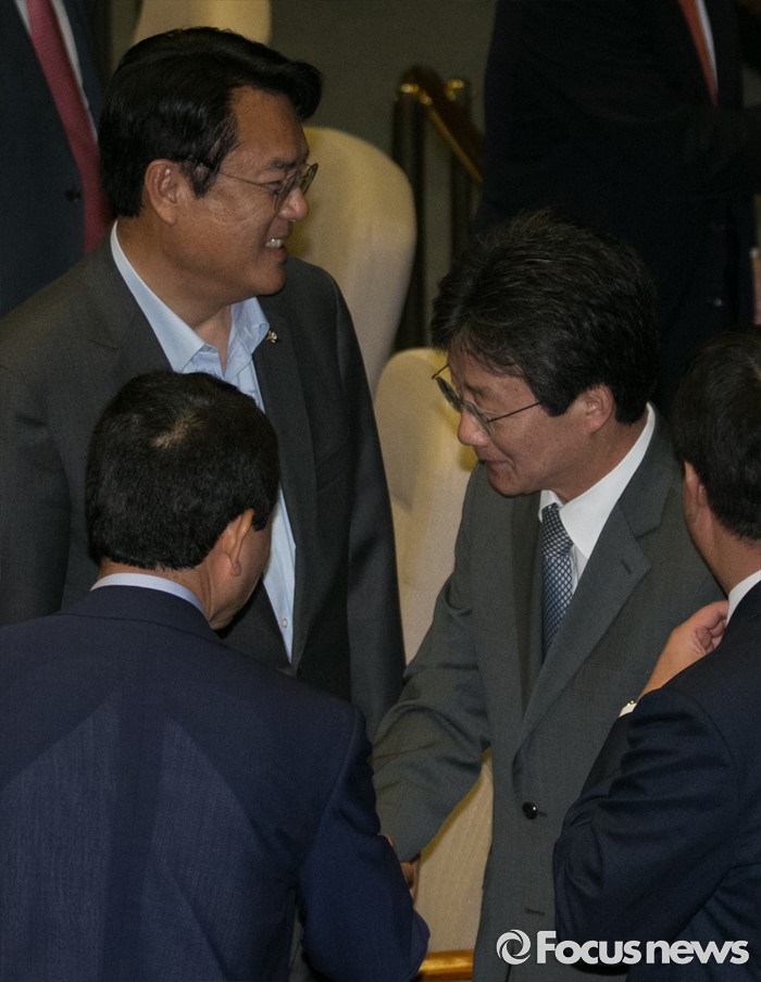 (서울=포커스뉴스) 21일 오전 서울 여의도 국회에서 열린 343회 국회(임시회) 4차 본회의에 참석한 정진석(왼쪽) 새누리당 원내대표와 유승민 의원 등이 인사하고 있다.