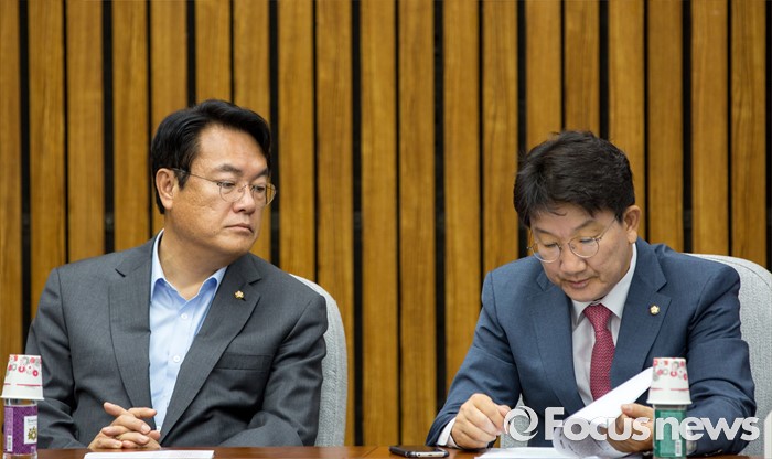 (서울=포커스뉴스) 정진석 새누리당 원내대표와 권성동 사무총장이 21일 오전 서울 여의도 국회에서 열린 원내대책회의에 참석하고 있다.