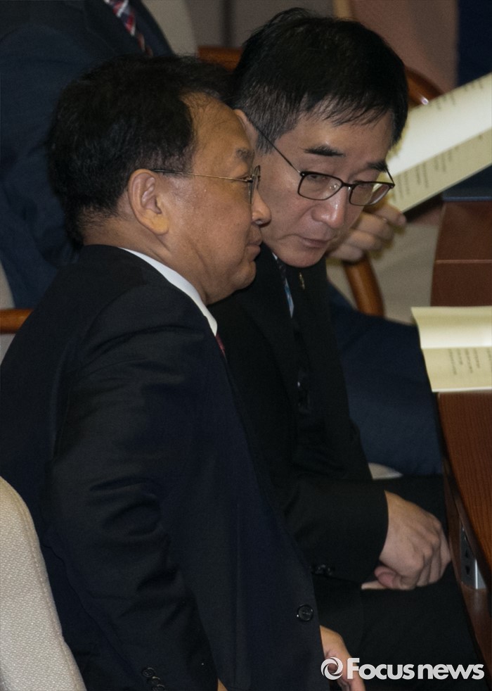 (서울=포커스뉴스) 21일 오전 서울 여의도 국회에서 열린 343회 국회(임시회) 4차 본회의에 참석한 유일호(왼쪽) 경제부총리 겸 기획재정부 장관과 이준식 사회부총리 겸 교육부 장관이 대화하고 있다.