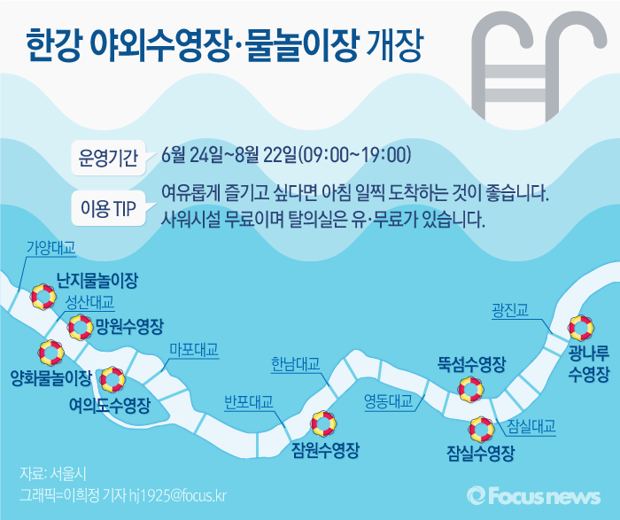 (서울=포커스뉴스) 14일 서울시는 한강 야외수영장 6곳과 강변물놀이장 2곳을 오는 24일 동시 개장한다고 밝혔다. 한강 야외수영장·물놀이장은 8월 22일까지 운영되며 이용시간은 오전 9시부터 오후 7시까지 이다.