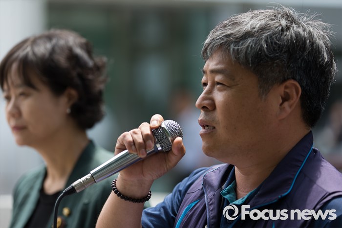 (서울=포커스뉴스) 21일 오전 서울 영등포구 산업은행 본점 앞에서 열린 조선해운업 구조조정 관련 정부와 금융당국, 산업은행 규탄 기자회견에서 이상진(오른쪽) 전국민주노동조합총연맹 부위원장이 모두발언 하고 있다.