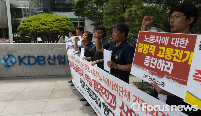 | △ 구호외치는 조선해운업 구조조정 관련 정부, 금융당국 규탄 기자회견 참석자들 |