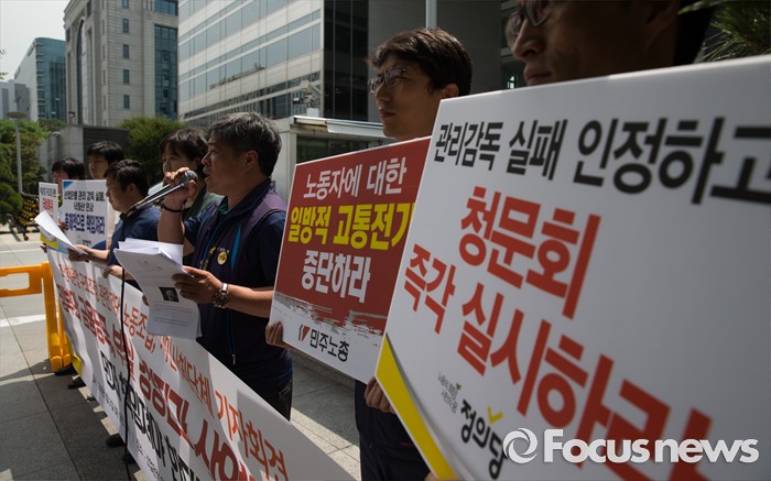 (서울=포커스뉴스) 21일 오전 서울 영등포구 산업은행 본점 앞에서 열린 조선해운업 구조조정 관련 정부와 금융당국, 산업은행 규탄 기자회견에서 이상진(가운데) 전국민주노동조합총연맹 부위원장이 모두발언 하고 있다.
