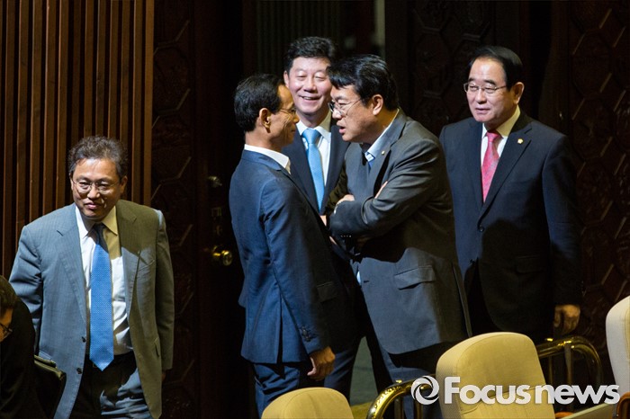 (서울=포커스뉴스) 정진석 새누리당 원내대표와 최정호 국토교통부 제2차관이 21일 오전 서울 여의도 국회에서 열린 본회의에 참석해 대화를 나누고 있다.