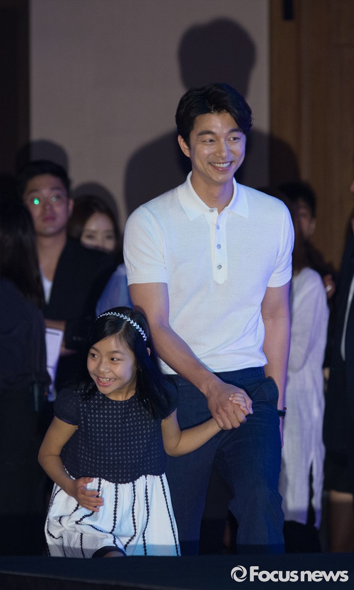 (서울=포커스뉴스) 21일 오전 서울 종로구 나인트리컨벤션에서 열린 영화 '부산행' 제작보고회에 참석한 배우 김수안(왼쪽)과 공유가 자리를 향해 이동하고 있다.