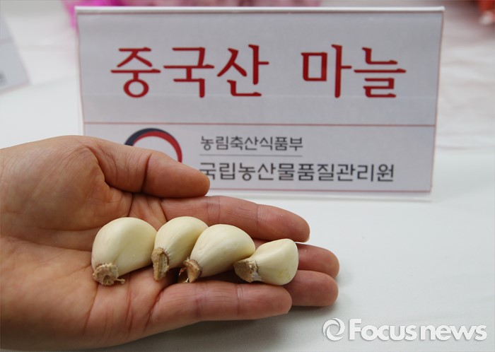 (세종=포커스뉴스) 국립농산물품질관리원 직원들이 21일 오전 세종시정부세종청사 농림축산식품부 기자실에서 국내산 마늘과 중국산 마늘을 비교하고 있다. 국산 마늘은 꼭지 부분 색이 검고, 딱딱한 부분이 붙어 있는 반면 중국산 마늘은 대부분 꼭지 부분에 딱딱한 부분이 붙어있지 않다.