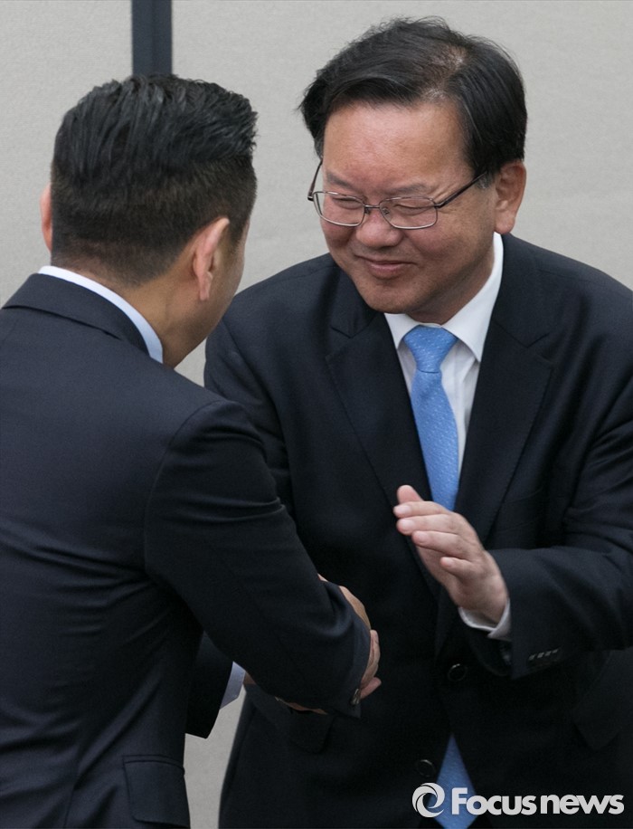 한편 더민주의 전당대회는 오는 8월27일 개최된다. 현재 김부겸·김진표·박영선·송영길·신경민·이종걸·추미애 의원 등이 후보군에 올랐다.김부겸 더불어민주당 대구 수성갑 당선인이 18일 오전 서울 여의도 국회에서 비상대책위원회의에 앞서 당직자들과 인사하고 있다. 2016.04.18 박동욱 기자