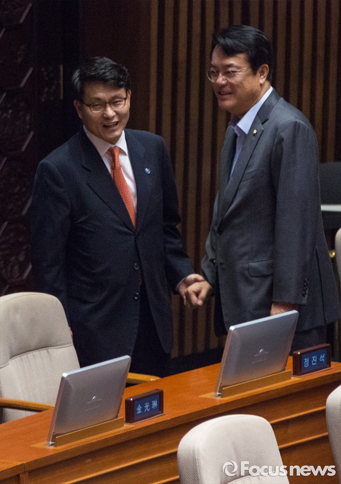 (서울=포커스뉴스) 정진석(오른쪽) 새누리당 원내대표와 윤상현 새누리당 의원이 21일 오전 서울 여의도 국회에서 열린 본회의에 참석해 대화를 나누고 있다.