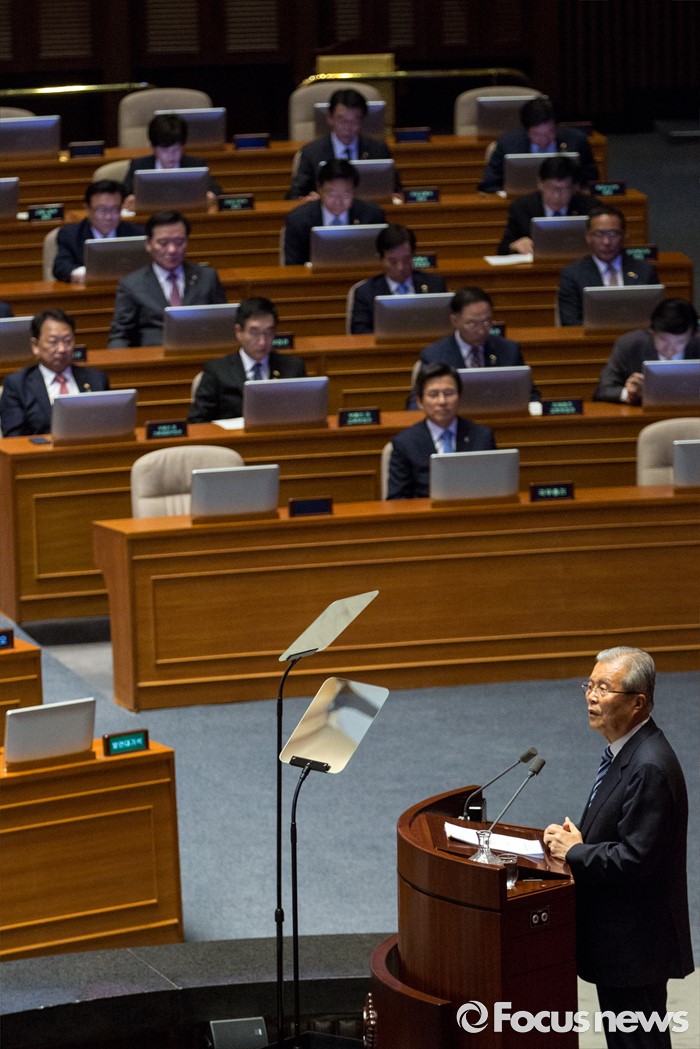 (서울=포커스뉴스) 김종인 더불어민주당 비상대책위 대표가 21일 오전 서울 여의도 국회에서 열린 본회의에 참석해 교섭단체대표 연설 하고 있다.