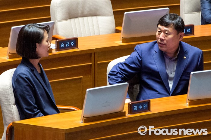 (서울=포커스뉴스) 김수민(왼쪽) 국민의당 의원이 21일 오전 서울 여의도 국회에서 열린 본회의에 참석해 김종훈 무소속 의원과 대화하고 있다.