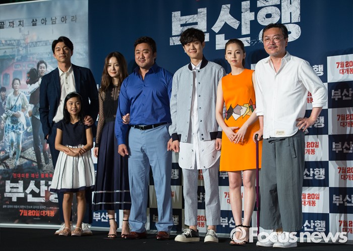 (서울=포커스뉴스) 21일 오전 서울 종로구 나인트리컨벤션에서 열린 영화 '부산행' 제작보고회에 참석한 출연진이 포토타임을 갖고 있다. 왼쪽부터 배우 공유, 김수안, 정유미, 마동석, 최우식, 안소희, 김의성.