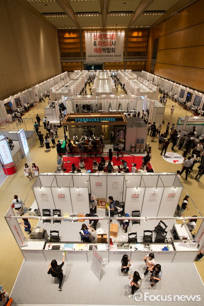 (서울=포커스뉴스) 21일 오후 서울 강남구 코엑스 D2홀에서 열린 신세계그룹&파트너사 채용박람회에서 구직자들이 희망 부스를 둘러보고 있다.