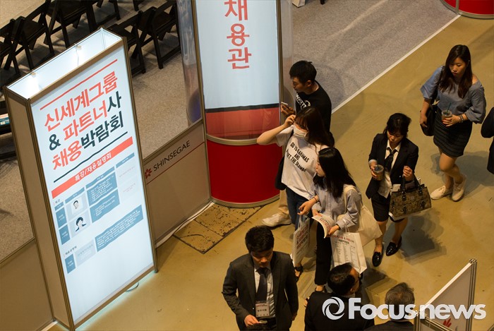 (서울=포커스뉴스) 21일 오후 서울 강남구 코엑스 D2홀에서 열린 신세계그룹&파트너사 채용박람회에서 구직자들이 희망 부스를 둘러보고 있다.