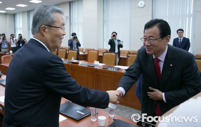 (서울=포커스뉴스) 21일 오전 서울 여의도 국회에서 열린 기획재정위원회 전체회의에 참석한 이현재(오른쪽) 새누리당 간사와 김종인 더불어민주당 비대위 대표가 인사하고 있다.