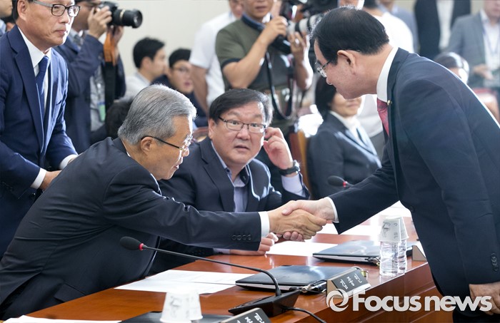 (서울=포커스뉴스) 21일 오전 서울 여의도 국회에서 열린 기획재정위원회 전체회의에 참석한 박명재(오른쪽) 새누리당 의원과 김종인 더불어민주당 비대위 대표가 인사하고 있다.