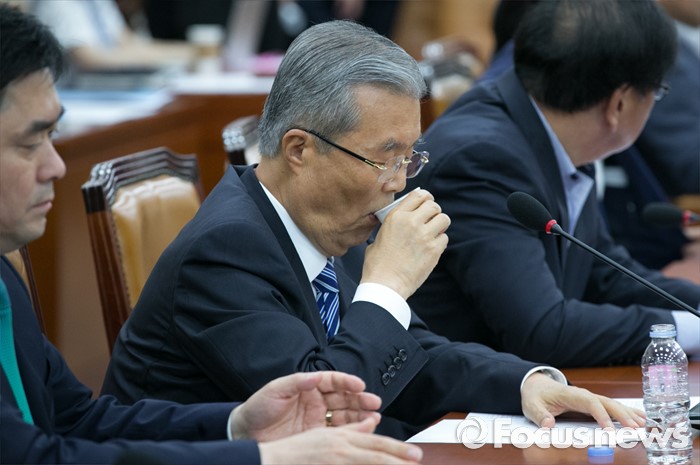 (서울=포커스뉴스) 21일 오전 서울 여의도 국회에서 열린 기획재정위원회 전체회의에 참석한 김종인 더불어민주당 비대위 대표가 물을 마시고 있다.