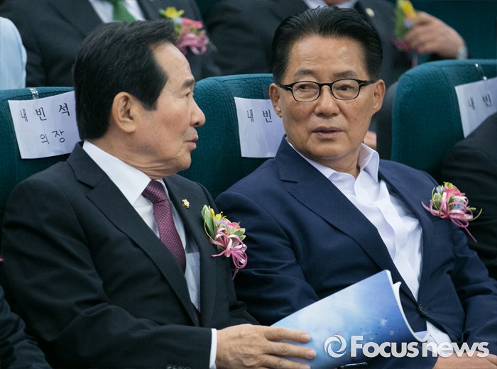 (서울=포커스뉴스) 21일 오후 서울 여의도 국회도서관에서 열린 사단법인 한국여성정치연맹 창립 25주년 기념 토론회에 참석한 정세균(왼쪽) 국회의장과 박지원 국민의당 원내대표가 대화하고 있다.