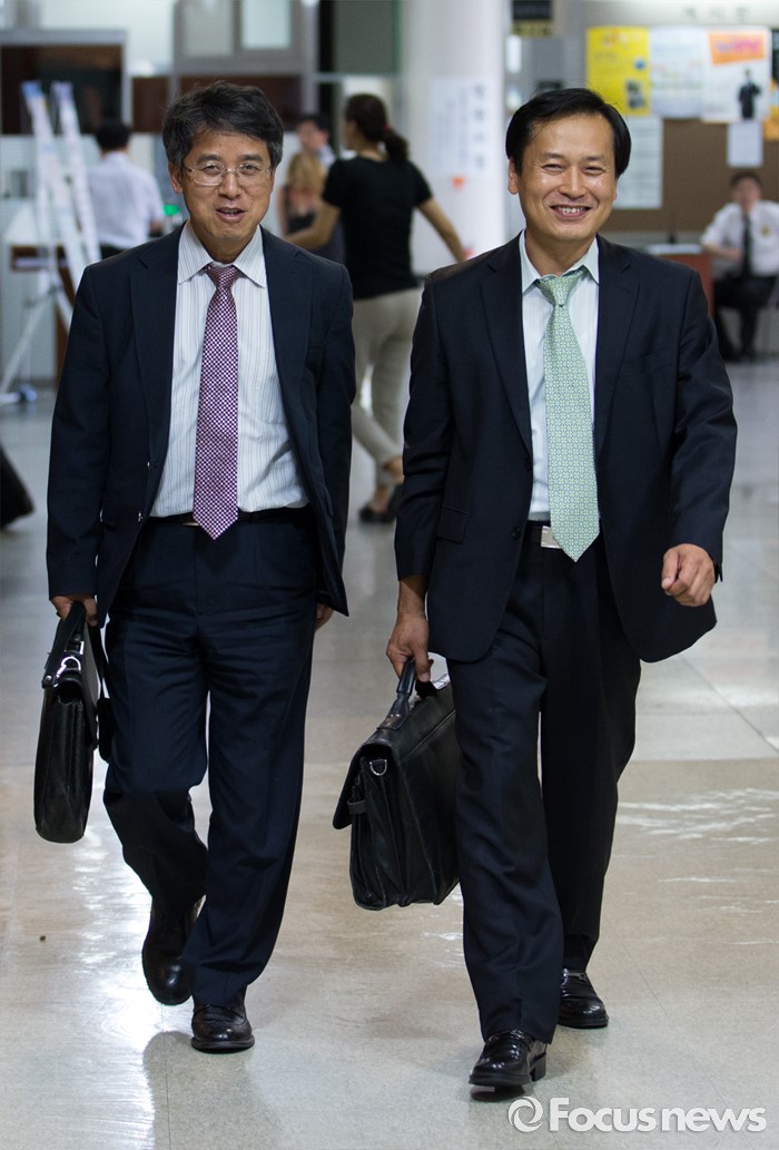 (서울=포커스뉴스) 채희준(오른쪽) 민주 사회를 위한 변호사모임 통일위원회 위원장과 천낙붕 변호사가 21일 오후 서울 서초구 서울중앙지방법원에서 국가정보원 상대 북한 식당종업원 인신구제청구 1차 심문기일에 참석하기 위해 법정으로 향하고 있다.