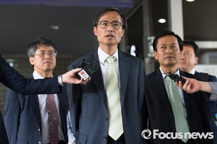 (서울=포커스뉴스) 천낙붕 민주 사회를 위한 변호사모임 소속 변호사가 21일 오후 서울 서초구 서울중앙지방법원에서 국가정보원 상대 북한 식당종업원 인신구제청구 1차 심문기일에 참석 전 취재진 질문에 답변하고 있다.