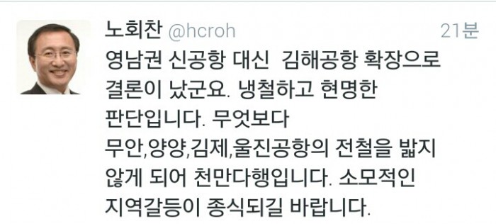 강 장관은 "이번에 제시된 김해공항 확장방안은 기존 김해공항을 단순히 보강하는 차원을 넘어 활주로, 터미널 등 공항시설을 대폭 신설하고, 공항으로의 접근 교통망도 함께 개선하는 방안"이라고 말했다.노회찬 정의당 원내대표가 21일 자신의 트위터에 "영남권 신공항 대신 김해공항 확장으로 결론이 났군요. 냉철하고 현명한 판단입니다"라는 글을 올렸다. 2016.06.21. <사진출처=노회찬 의원 트위터 캡처>
