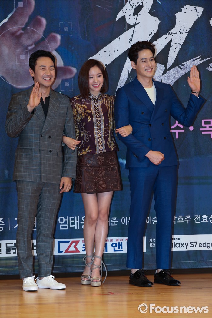 (서울=포커스뉴스) 21일 오후 서울 양천구 목동SBS에서 열린 SBS드라마스페셜 원티드 제작발표회에 참석한 배우 엄태웅,배우 김아중, 배우 백해준이 포토타임을 갖고 있다.