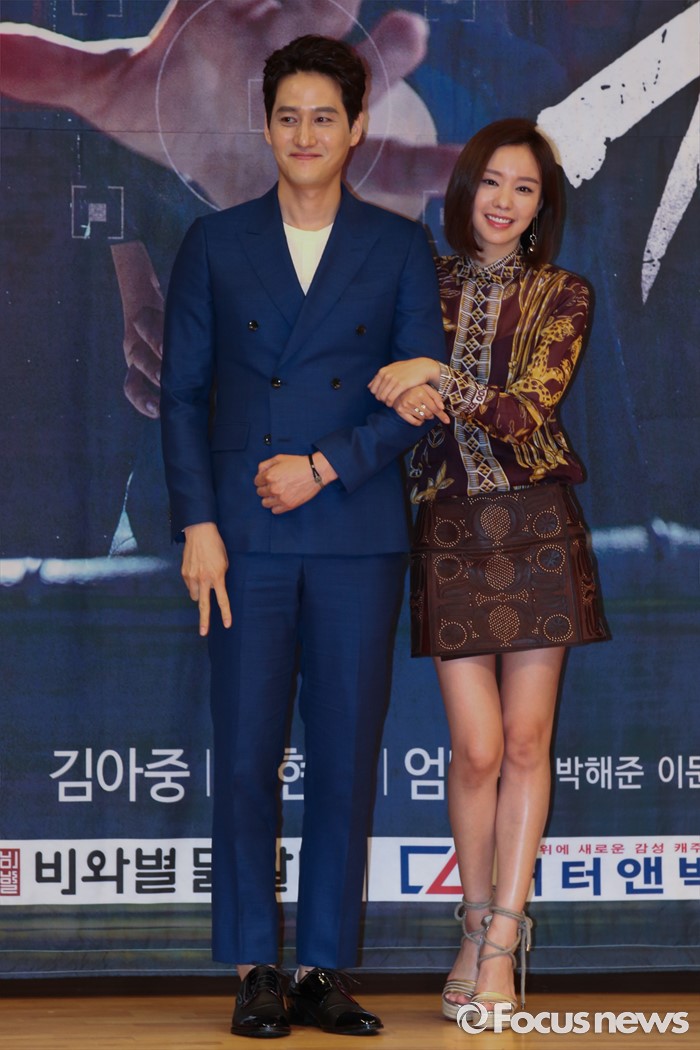 (서울=포커스뉴스) 21일 오후 서울 양천구 목동SBS에서 열린 SBS드라마스페셜 원티드 제작발표회에 참석한 배우 박해준,배우 김아중이 포토타임을 갖고 있다.
