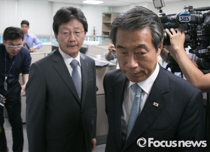(서울=포커스뉴스) 정종섭(오른쪽), 유승민 새누리당 의원이 21일 오후 서울 여의도 국회 의원회관 윤재옥 의원실에서 대구 지역 의원모임을 갖고 영남권 신공항 결과 발표를 지켜본 뒤 퇴장하고 있다.