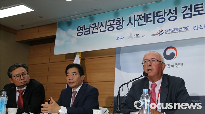 (세종=포커스뉴스) 장 마리 슈발리에 프랑스 파리공항공단자회사 ADPi 수석엔지니어가 21일 오후 세종시 정부세종청사 국토교통부 브리핑실에서 열린 동남권 신공항 타당성 검토 연구 최종 보고회에서 입지선정 결과 발표를 마치고 취재진의 질문에 답변하고 있다. 왼쪽부터 손명수 국토부 공항항행정책관, 서훈택 국토부 항공정책실장, 장 마리 슈발리에 프랑스 파리공항공단자회사 ADPi 수석엔지니어.
