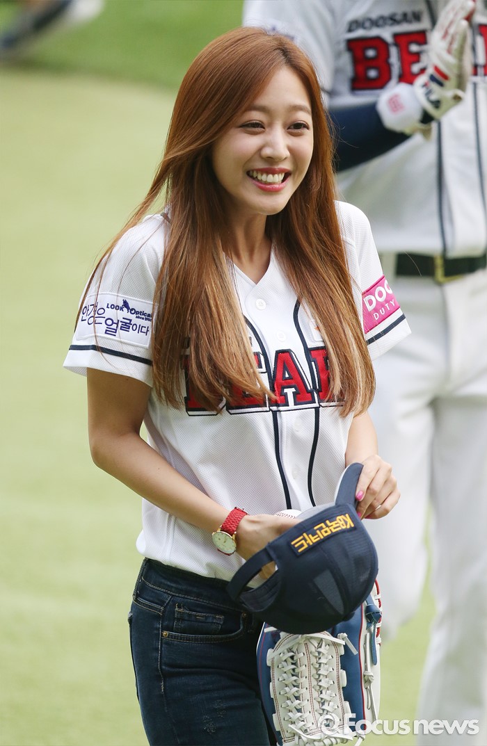 (서울=포커스뉴스) 21일 서울 잠실구장에서 열린 2016 프로야구 kt-두산 경기에서 시구자로 나온 배우 조보아가 시구를 마치고 마운드를 내려오고 있다.