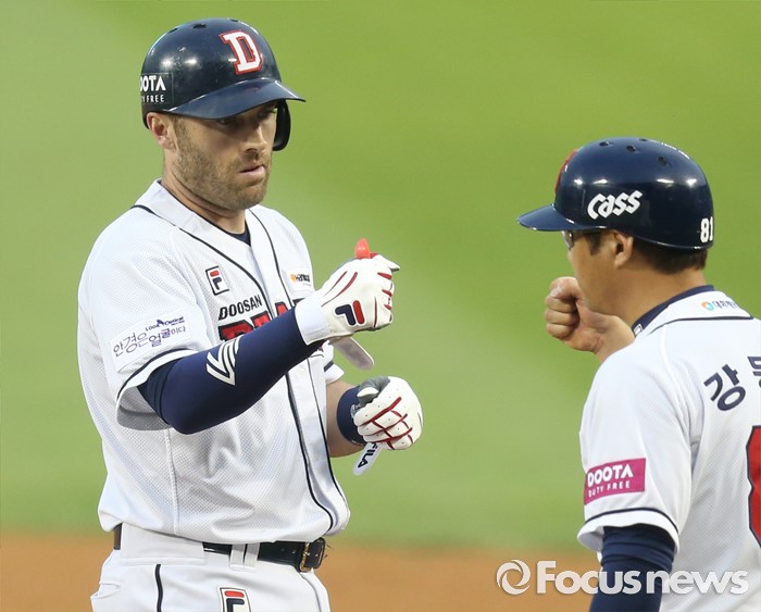 (서울=포커스뉴스) 12일 서울 잠실구장에서 열린 2016 프로야구 kt-두산 경기 3회말 1사 1,2루에서 두산 에반스가 좌중간 안타로 선취 타점을 올리고 1루에서 강동우 코치의 축하를 받고 있다.