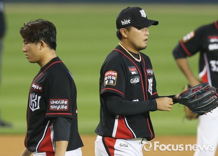(서울=포커스뉴스) 12일 서울 잠실구장에서 열린 2016 프로야구 kt-두산 경기 4회말 무사 1,3루에서 kt 선발투수 장시환(왼쪽)이 마운드를 내려가고 이상화가 오르고 있다.