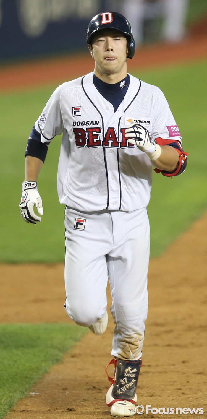 (서울=포커스뉴스) 12일 서울 잠실구장에서 열린 2016 프로야구 kt-두산 경기 5회말 무사 두산 박건우가 좌월 솔로 홈런을 치고 홈인하고 있다.