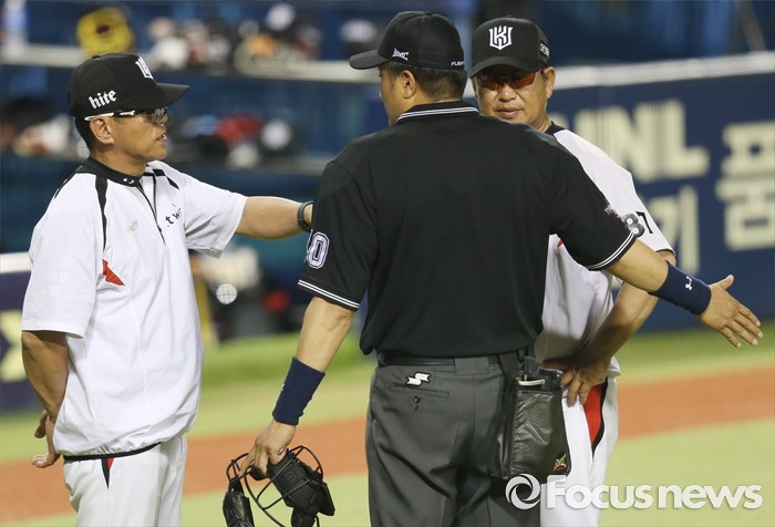 (서울=포커스뉴스) 12일 서울 잠실구장에서 열린 2016 프로야구 kt-두산 경기 5회말 kt 조범현 감독이 윤상원 주심에게 항의하고 있다.