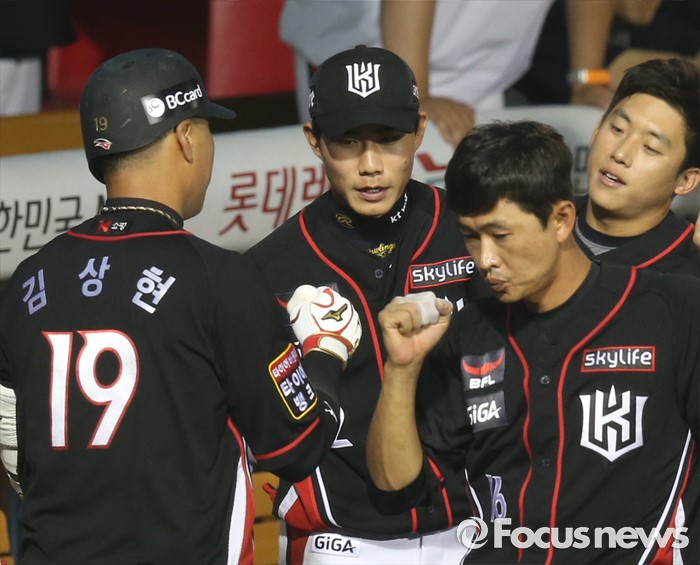 (서울=포커스뉴스) 12일 서울 잠실구장에서 열린 2016 프로야구 kt-두산 경기, 8회초 2사후 kt 김상현이 좌중월 솔로 홈런으로 팀 첫 안타를 치고 덕아웃에서 동료들의 축하를 받고 있다.