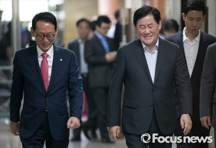 (서울=포커스뉴스) 22일 오전 서울 여의도 국회에서 열린 새누리당 신공항 관련 5개 시도 중진의원 간담회에 김도읍(왼쪽) 원내수석부대표와 최경환 의원이 참석하고 있다.