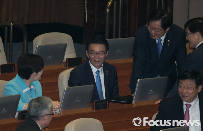 (서울=포커스뉴스) 22일 오전 서울 여의도 국회에서 열린 343회 국회(임시회) 5차 본회의에 참석한 강호인 국토교통부 장관이 국무위원들과 인사하고 있다.