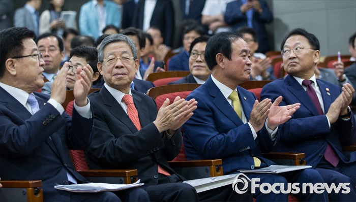 (서울=포커스뉴스) 김광림(왼쪽부터) 새누리당 의원, 김희옥 혁신비상대책위원장, 장병완 국민의당 의원, 유일호 경제부총리가 22일 오전 서울 여의도 국회 의원회관에서 열린 경제재정연구포럼 토론회에서 참가자 소개에 박수를 보내고 있다.