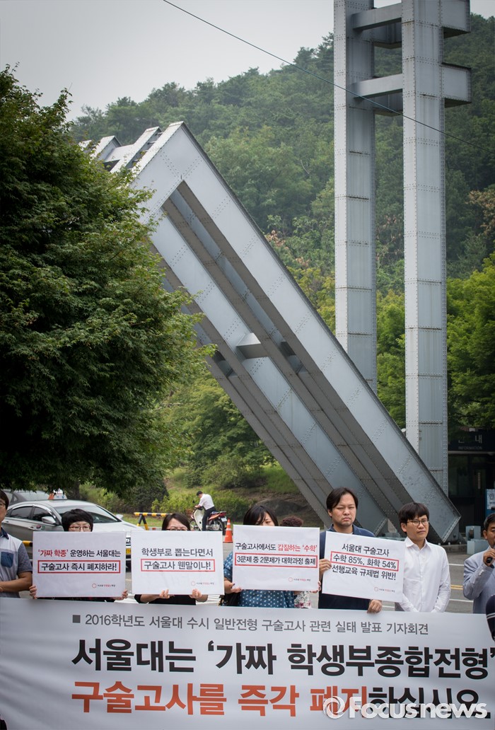 (서울=포커스뉴스) 22일 오전 서울대학교 정문 앞에서 시민단체 '사교육걱정없는세상' 회원들이 '2016학년도 서울대 수시 일반전형 구술고사 관련 실태 발표' 기자회견을 열고 있다.