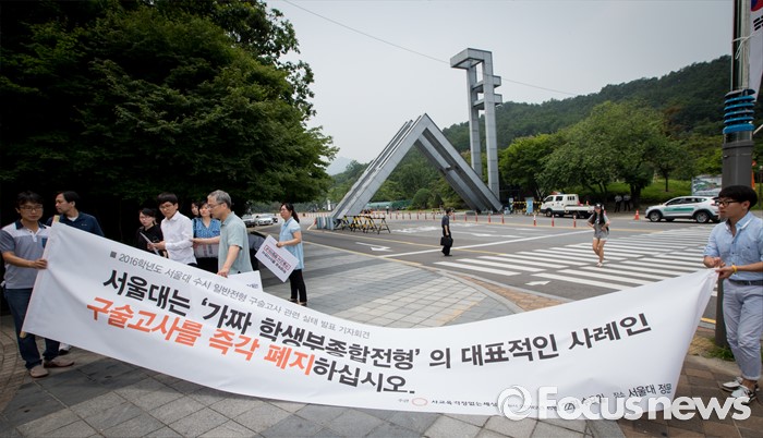 (서울=포커스뉴스) 22일 오전 서울대학교 정문 앞에서 시민단체 '사교육걱정없는세상' 회원들이 '2016학년도 서울대 수시 일반전형 구술고사 관련 실태 발표' 기자회견을 마친 후 대형 펼침막을 정리하고 있다.