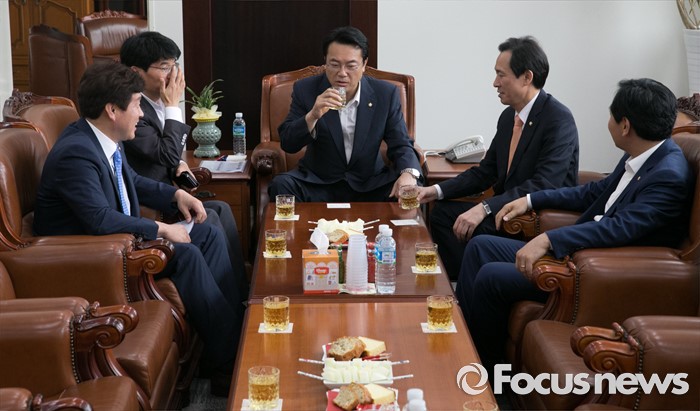 (서울=포커스뉴스) 22일 오전 서울 여의도 국회에서 운영위원회 전체회의를 마친 뒤 정진석 새누리당 원내대표, 우상호 더불어민주당 원내대표 등 의원들이 음료를 마시며 논의하고 있다. 왼쪽부터 기동민 더불어민주당 원내대변인, 박완주 원내수석부대표, 정진석 새누리당 원내대표, 우상호 더불어민주당 원내대표, 김관영 국민의당 원내수석부대표.