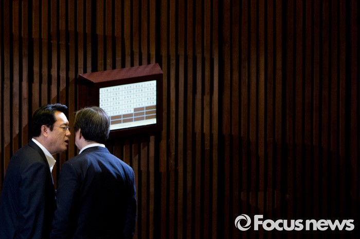 (서울=포커스뉴스) 정진석 새누리당 원내대표와 김무성 새누리당 전 대표가 22일 오전 서울 여의도 국회에서 열린 본회의에 참석해 대화 하고 있다.