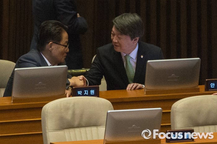 (서울=포커스뉴스) 안철수(오른쪽) 국민의당 상임공동대표와 박지원 원내대표가 22일 오전 서울 여의도 국회에서 열린 본회의에 참석해 대화 나누고 있다.