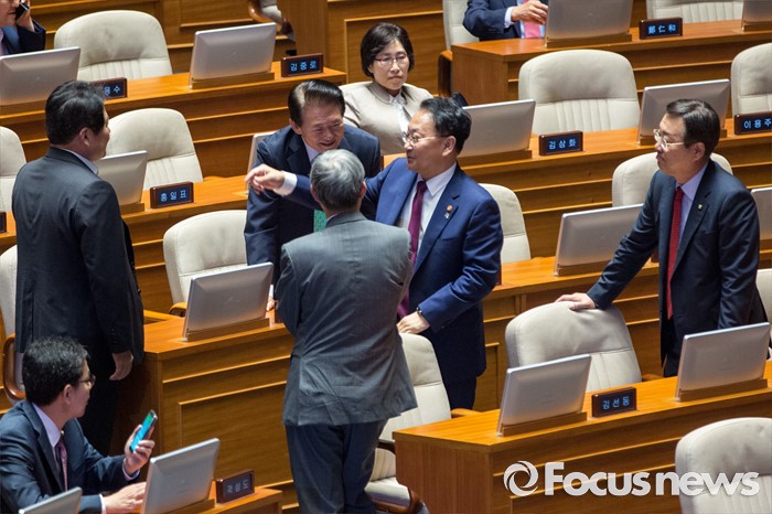(서울=포커스뉴스) 유일호 경제부총리 겸 기획재정부 장관이 22일 오전 서울 여의도 국회에서 열린 본회의에 참석해 의원들과 대화 하고 있다.