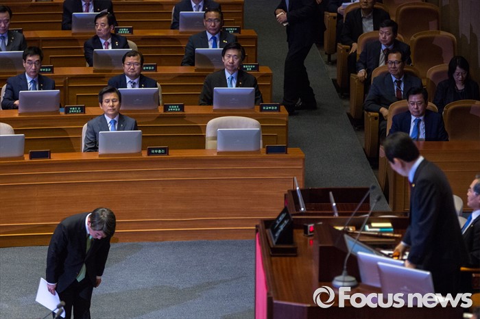 (서울=포커스뉴스) 안철수 국민의당 상임공동대표가 22일 오전 서울 여의도 국회에서 열린 본회의에 참석해 교섭단체대표연설을 마친 뒤 정세균 국회의장에게 인사 하고 있다.