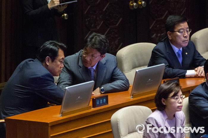 (서울=포커스뉴스) 정진석 새누리당 원내대표와 권성동 사무총장이 22일 오전 서울 여의도 국회에서 열린 본회의에 참석해 대화 하고 있다.