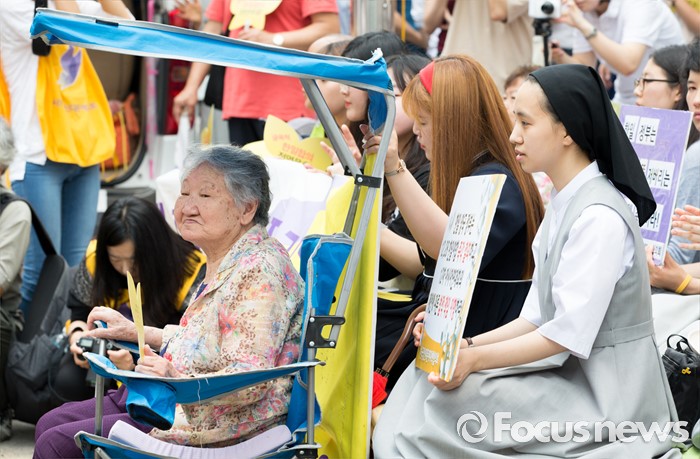 (서울=포커스뉴스) 22일 오후 서울 종로구 옛 일본대사관 앞에서 제1236차 일본군 위안부 문제해결을 위한 정기수요집회가 열리고 있다.