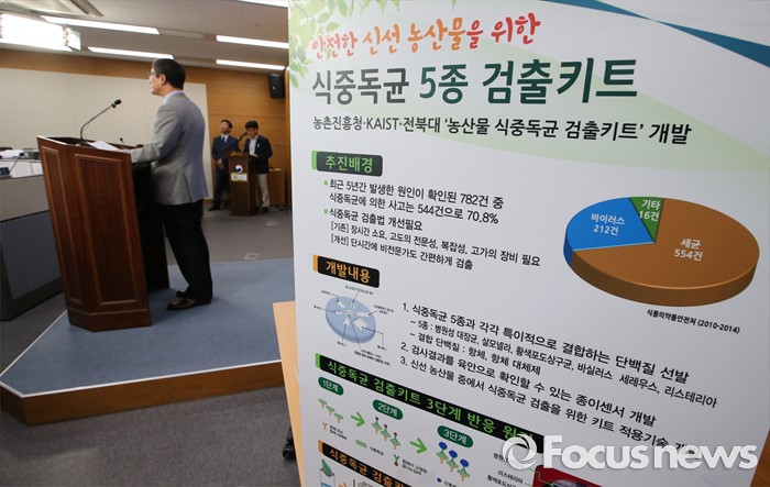 식중독균 검출키트는 농진청과 KAIST, 전북대가 공동으로 개발, 식중독균 5종을 1시간 안에 동시에 검출 할 수 있으며, 다이얼 모양의 종이 기반 감지기에 시료를 넣고 돌리면 중앙의 원 안에 청색 선이 보이면서 식중독균을 확인할 수 있다.